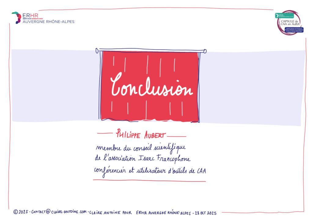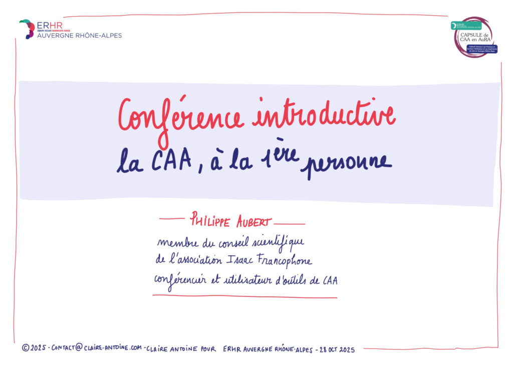 Retrouvez les planches de la facilitation graphique réalisées en direct lors de la Conférence « La CAA, en avant ! La Communication Alternative et Améliorée (CAA) en Auvergne-Rhône-Alpes, initiatives locales et enjeux de société » qui a eu lieu le 28 octobre 2025 à Lyon :